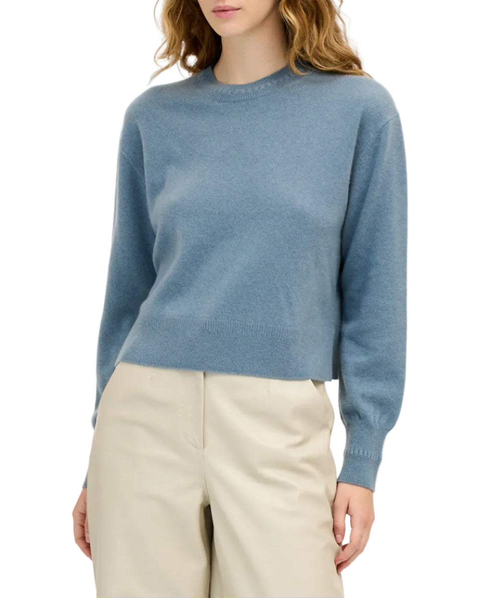 The Lexia Sweater is the ultimate in quiet luxury—crafted from 100% cashmere in a soft steel blue hue. Its timeless design features a relaxed, slightly cropped silhouette with refined ribbed detailing at the cuffs and hem. Lightweight yet cozy, this sweater offers year-round versatility, pairing effortlessly with tailored pants, skirts, or denim.