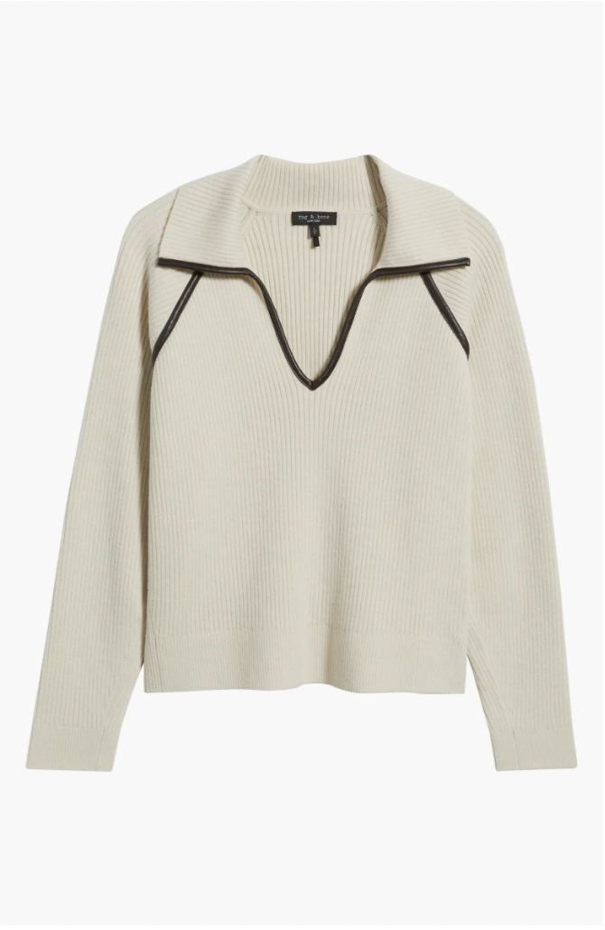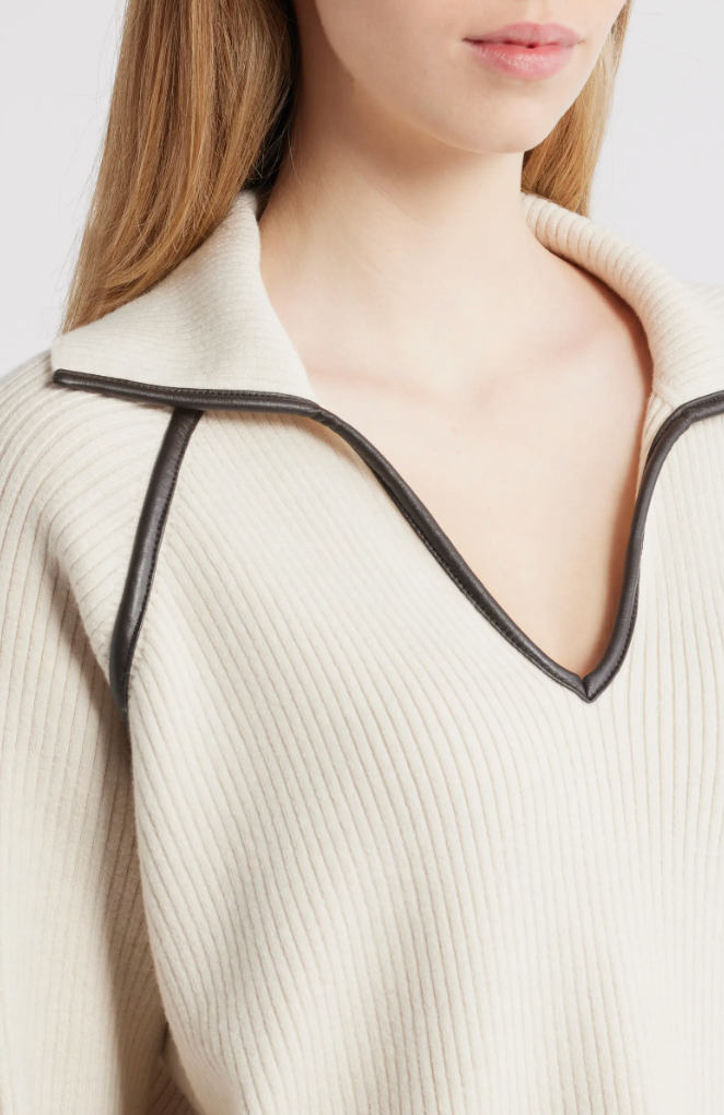 Elevated essentials, refined to perfection. This ribbed knit polo combines soft wool-blend comfort with sleek faux-leather piping for a modern edge. The Johnny collar and long sleeves lend timeless polish, while a hint of stretch ensures an easy, flattering fit. Effortlessly chic tucked into tailored trousers or paired with denim for an off-duty upgrade.