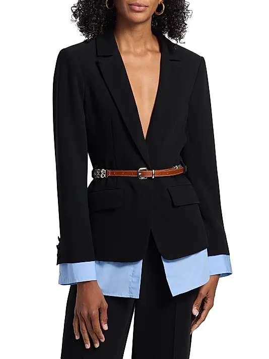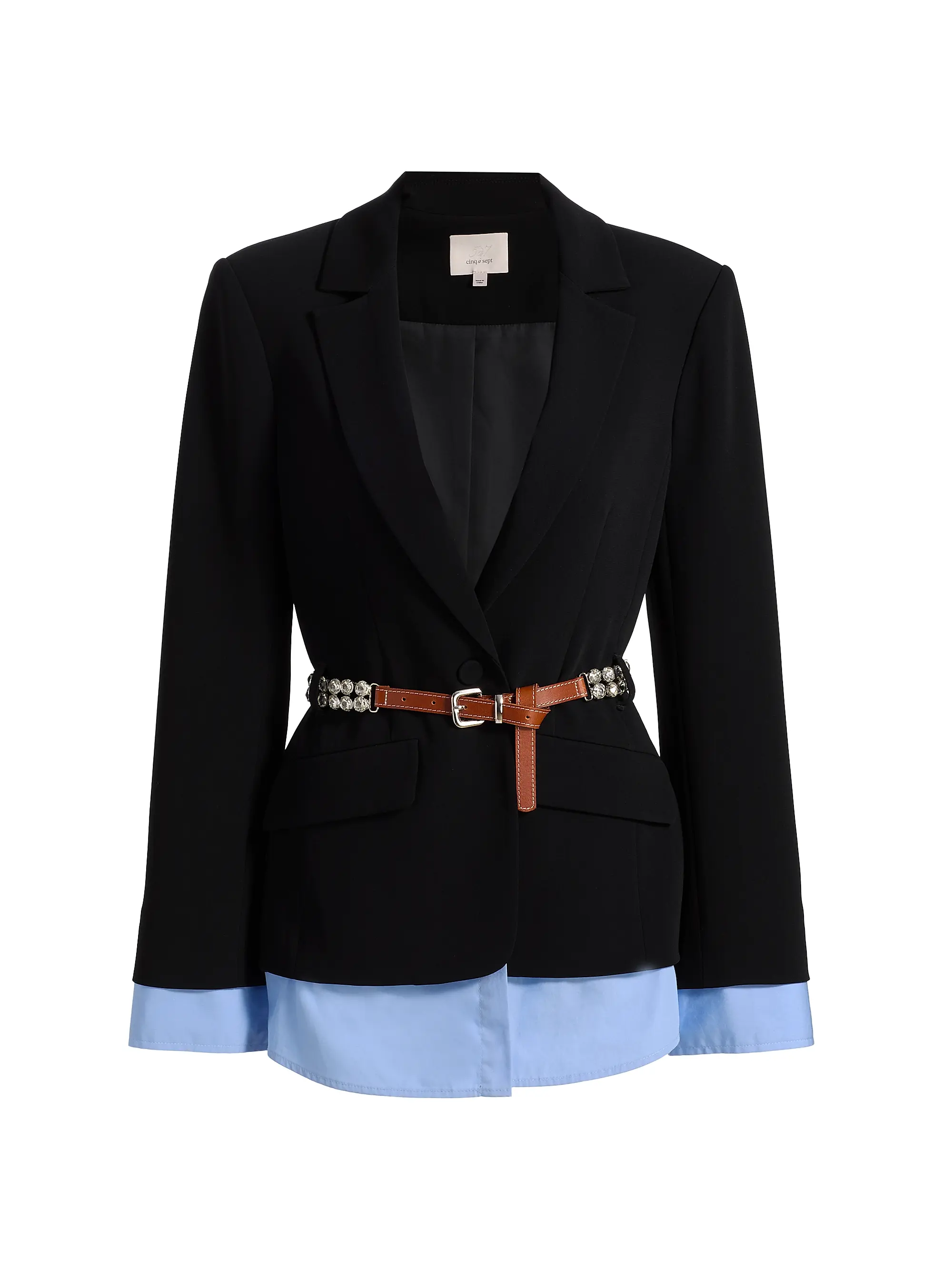 A polished take on tailoring with a touch of sparkle. The Vittoria Jacket is designed with a single-breasted silhouette, finished with a crystal-embellished belt that cinches the waist for a flattering fit. Notch lapels, a shirt-like hem, and long sleeves lend modern refinement to this statement piece.