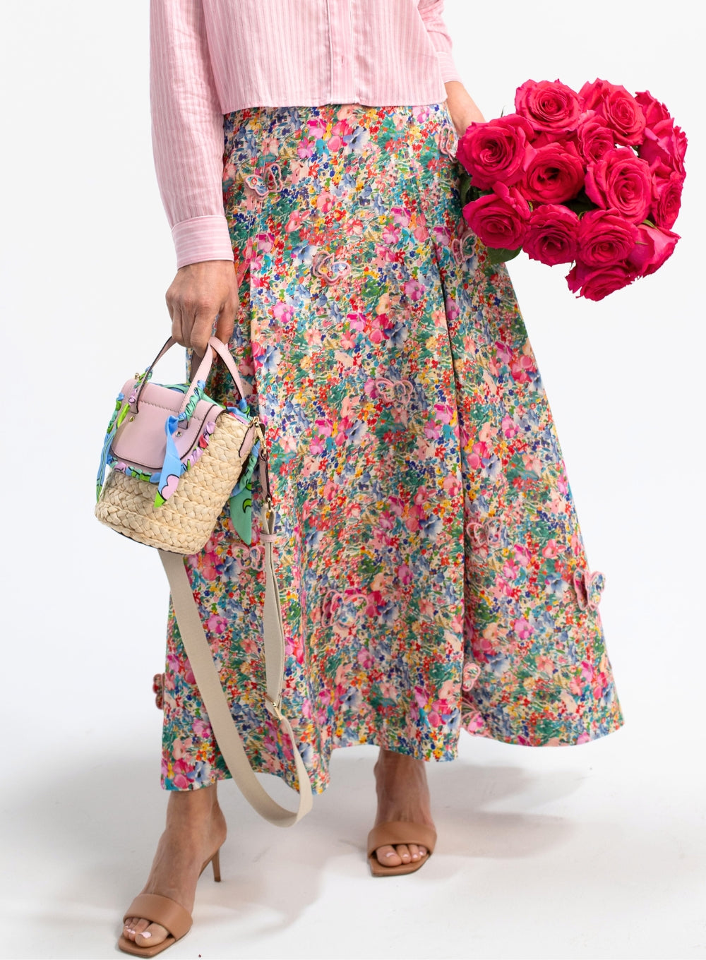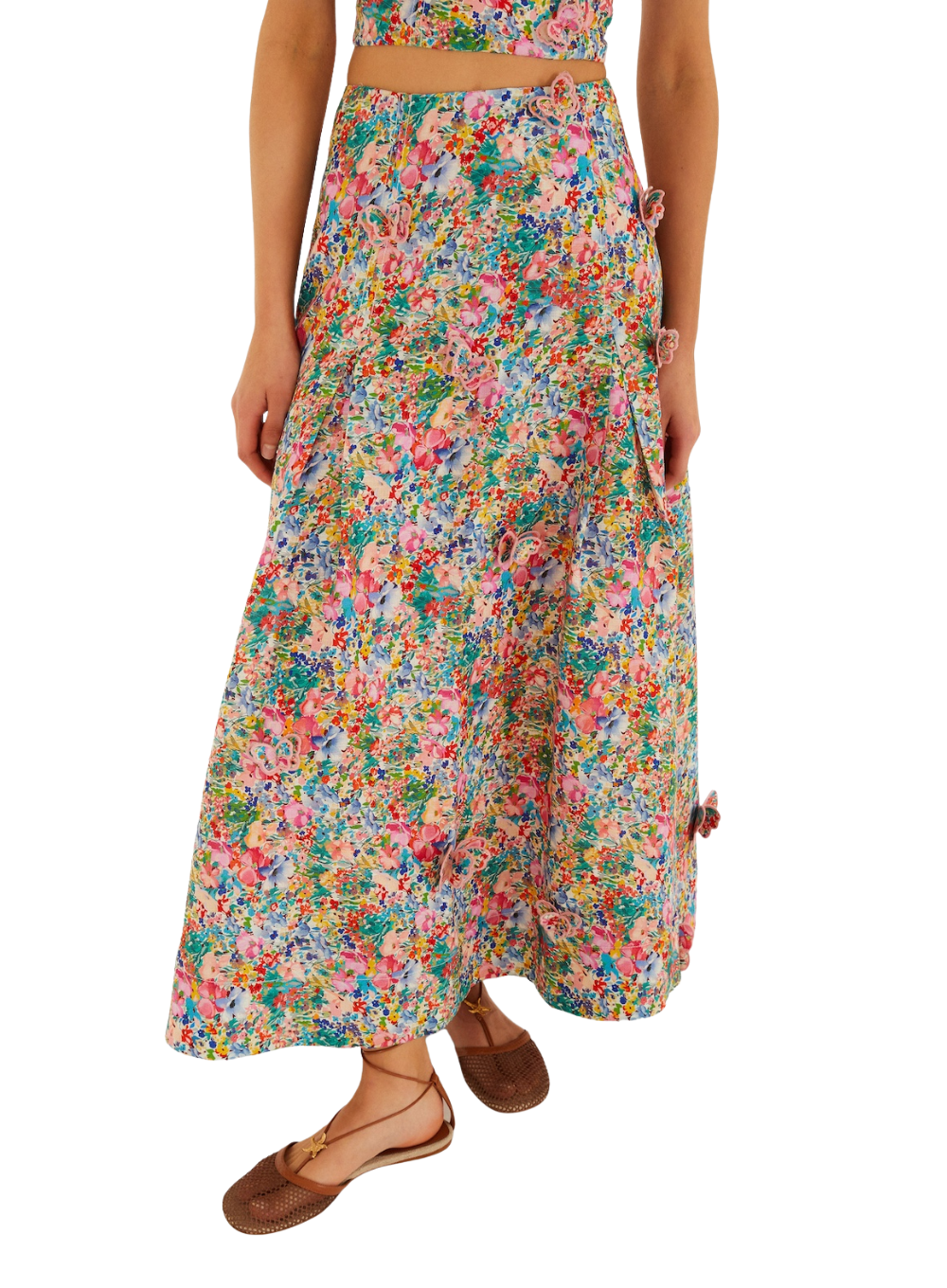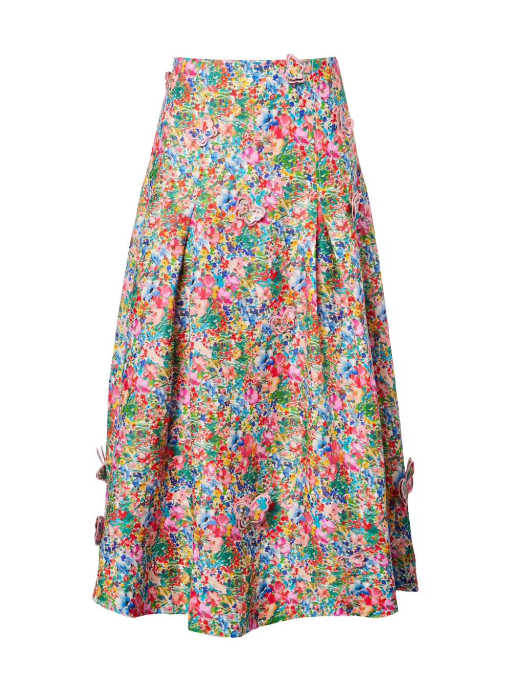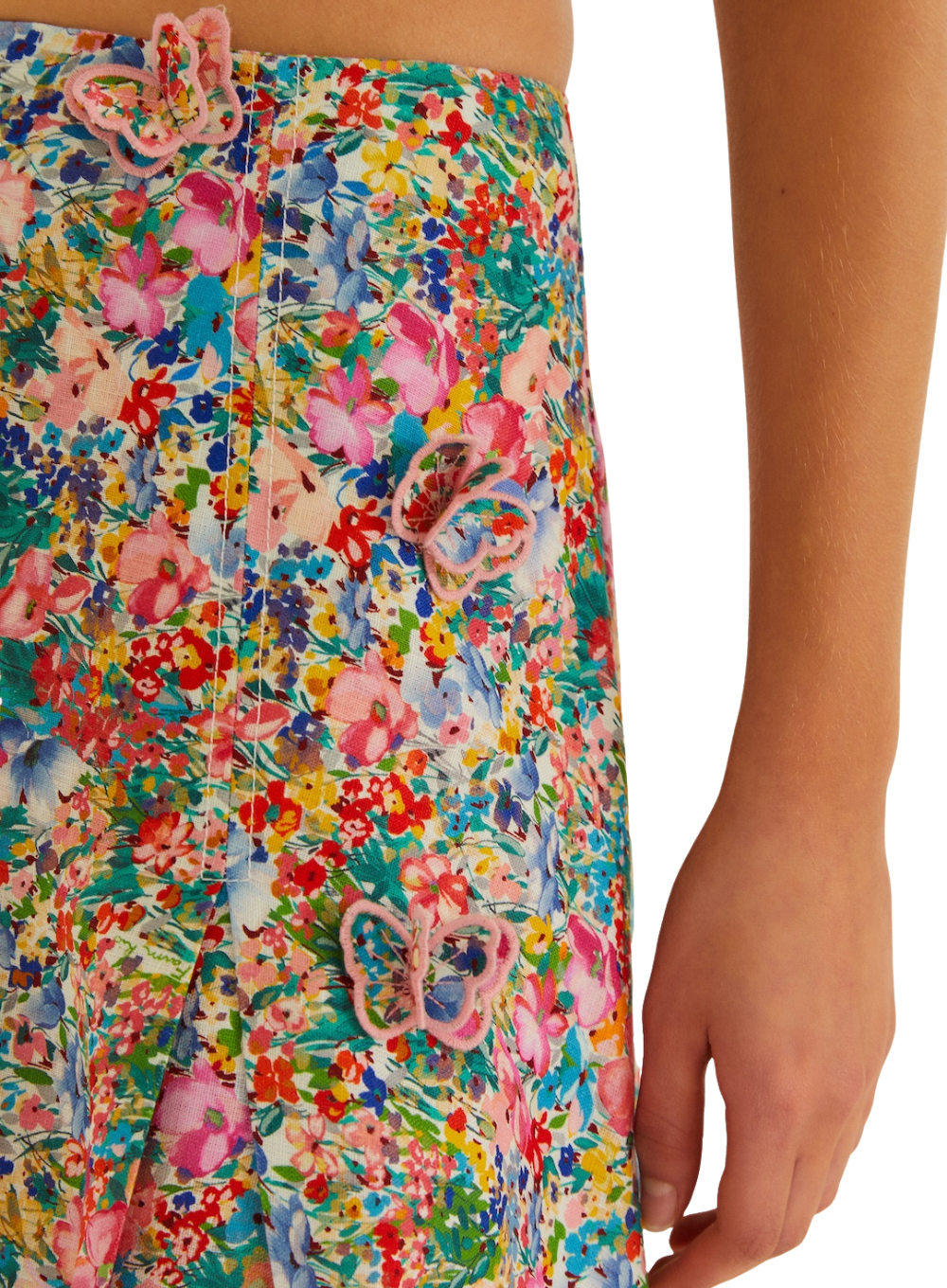 A breezy statement piece with romantic charm. The Peasant Floral Maxi Skirt features a vibrant allover floral print with delicate butterfly appliqués for added texture and whimsy. Designed in airy linen with a flowing, full-length silhouette for effortless movement.