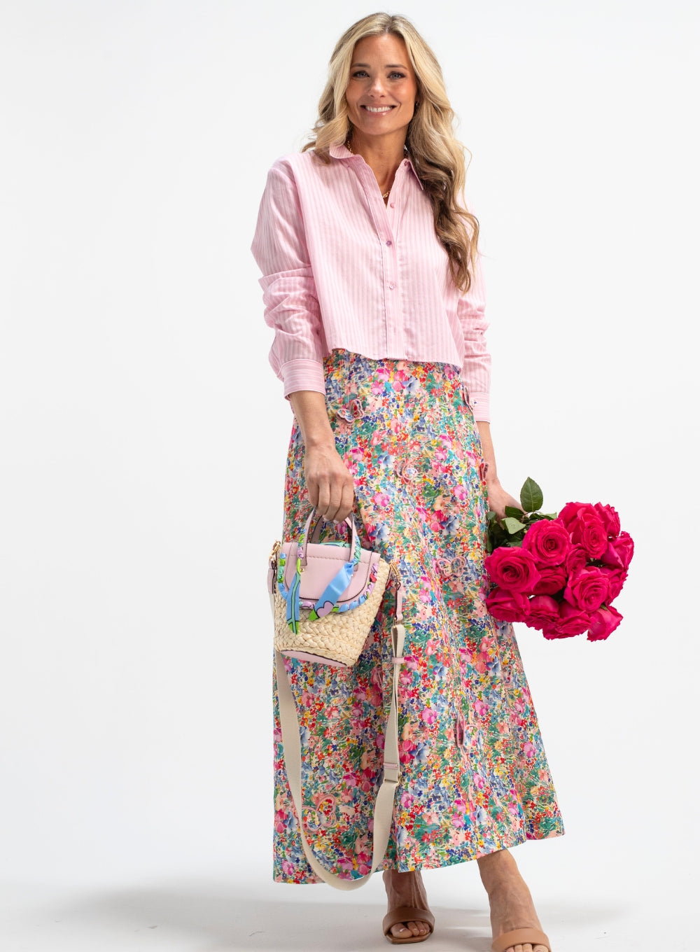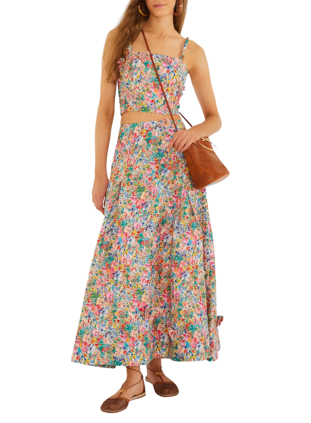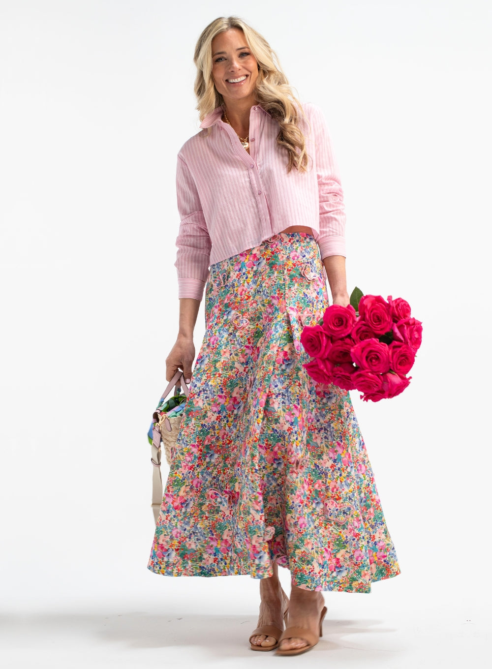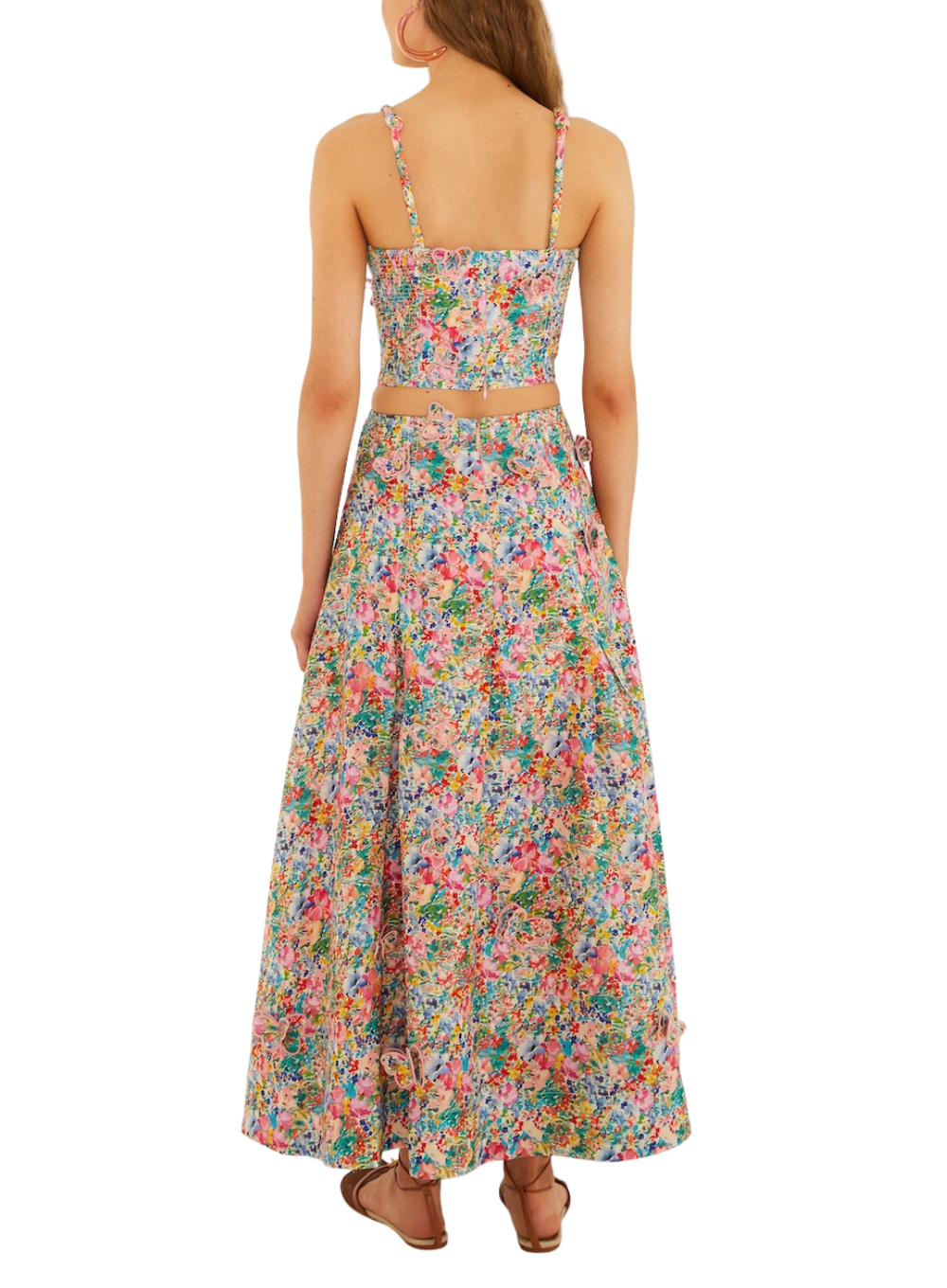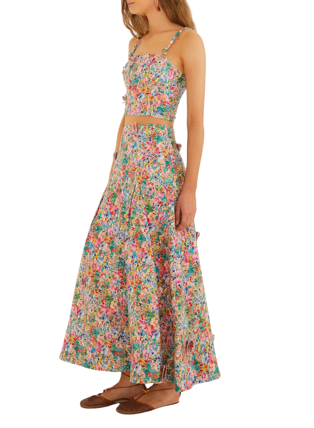 A breezy statement piece with romantic charm. The Peasant Floral Maxi Skirt features a vibrant allover floral print with delicate butterfly appliqués for added texture and whimsy. Designed in airy linen with a flowing, full-length silhouette for effortless movement.