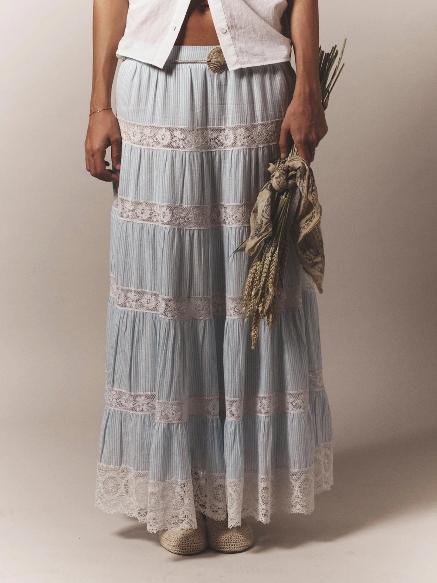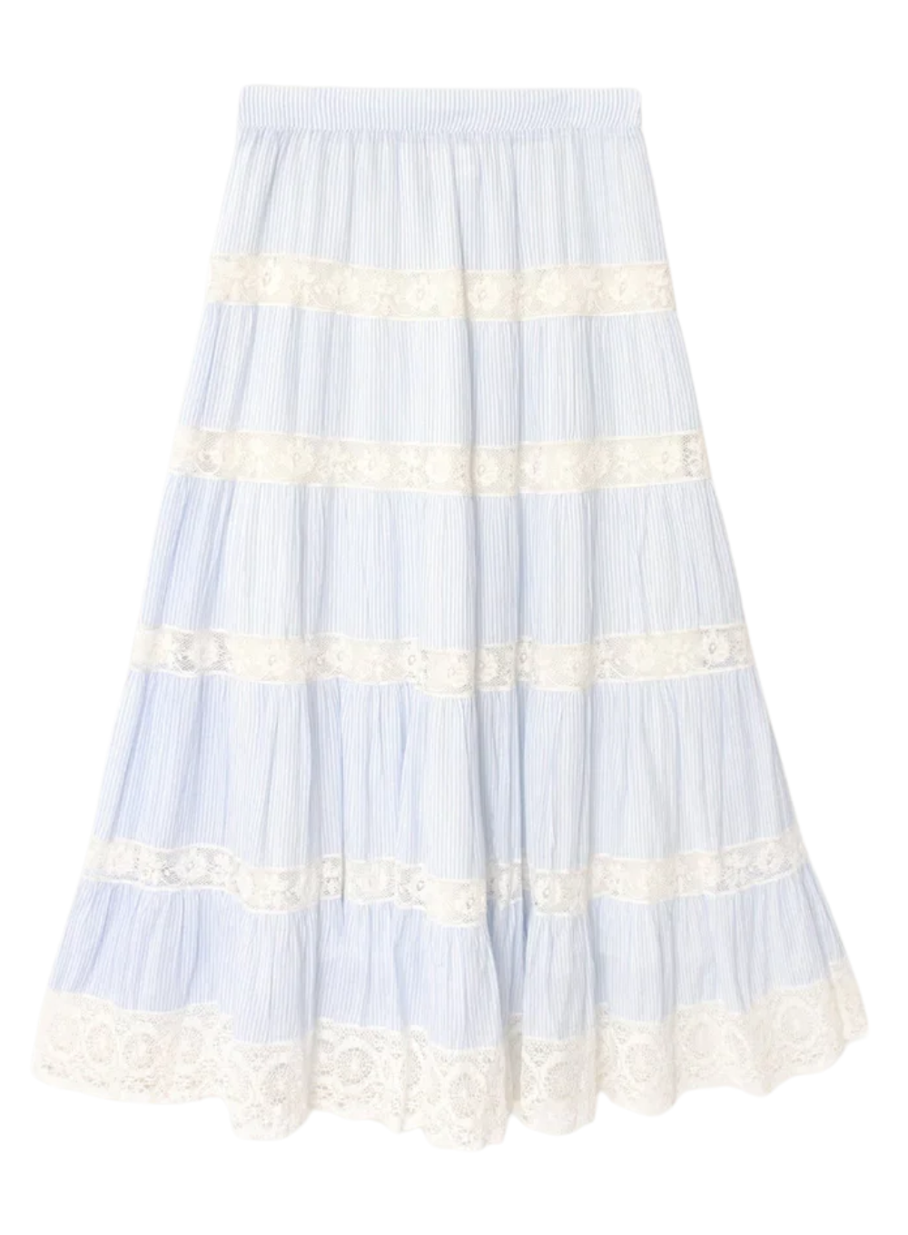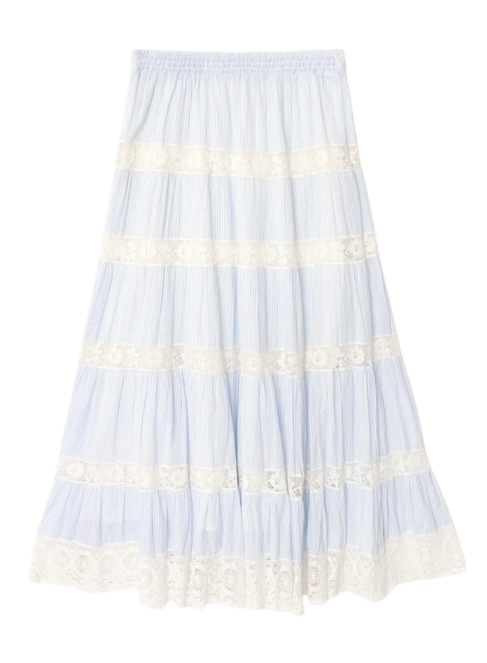 Delicate Details. The Blue White Stripe Amore Skirt is new this season in superfine cotton voile with a soft hand and airy feel. This ultra-feminine midi silhouette features a flattering flat front waistband and an elasticized back for a comfortable, flexible fit. Finished with delicate lace trim throughout, it brings a romantic touch to everyday dressing. Pair it with the matching blouse or a simple knit for effortless, polished style.