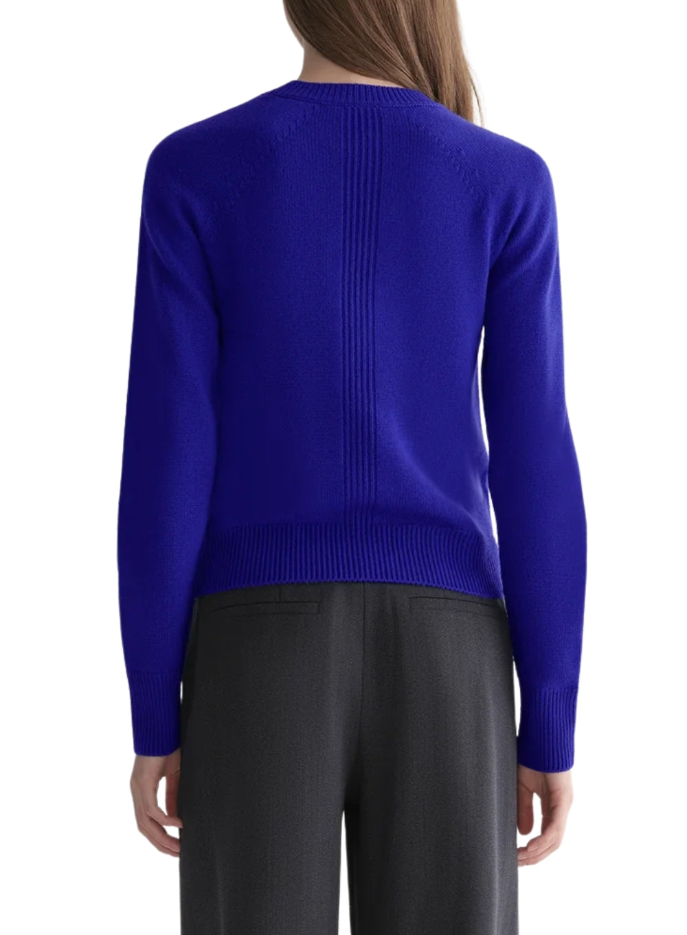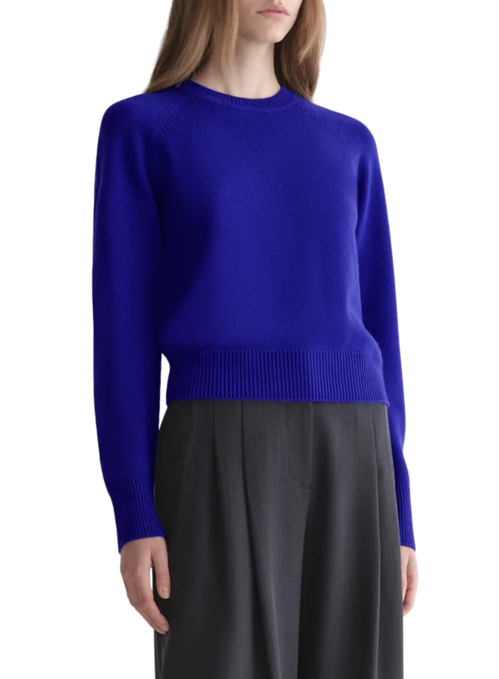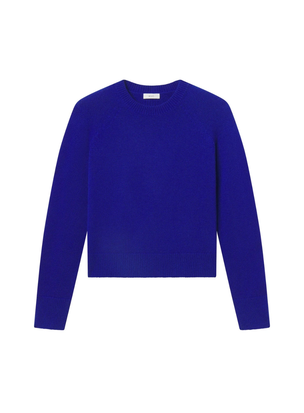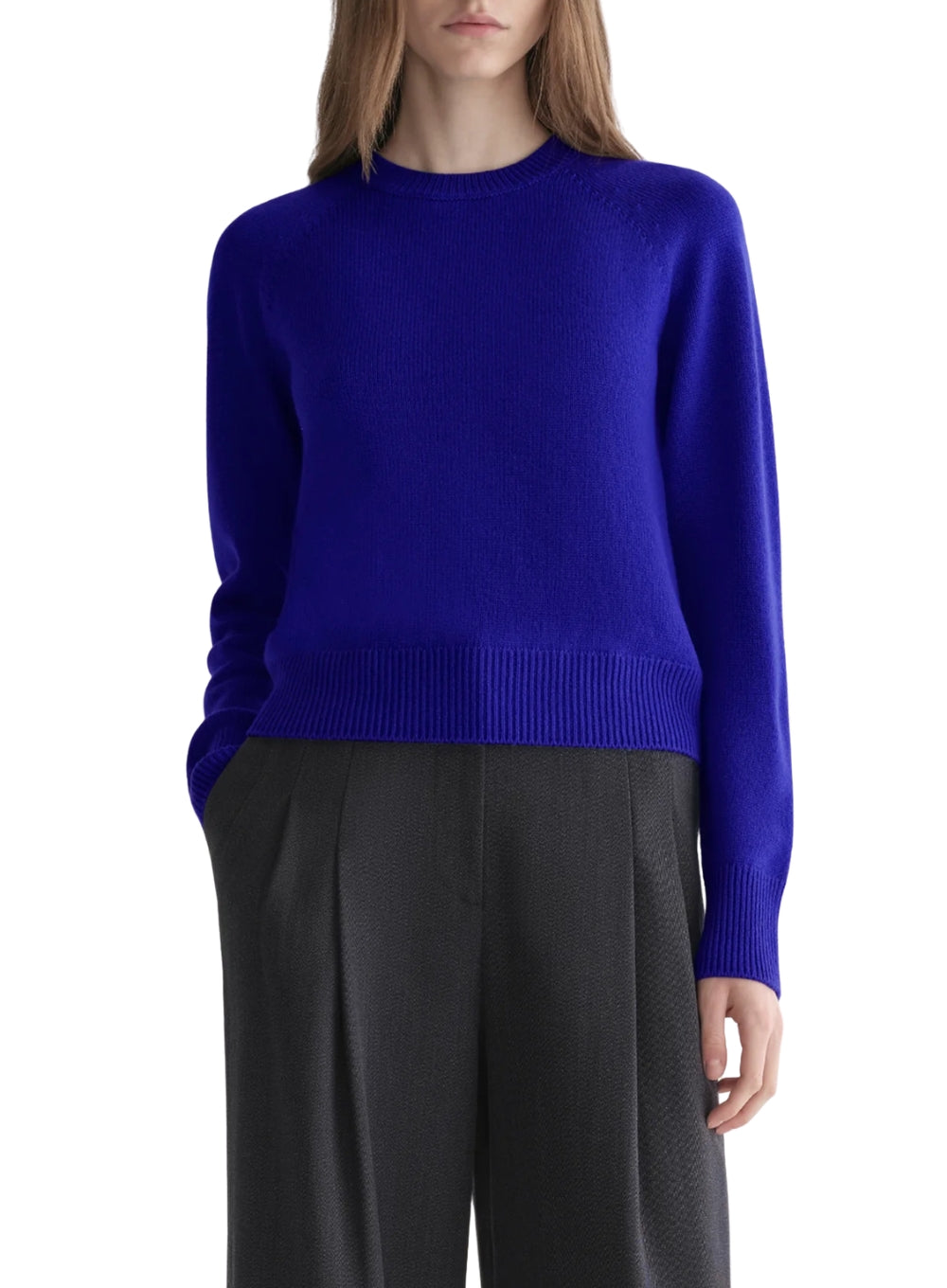 The Ashtyn Sweater is crafted from ultra-soft pure cashmere in a striking cobalt blue hue. Designed with a classic crew neckline and raglan sleeves, this timeless knit offers effortless sophistication and comfort. Ribbed trims at the cuffs, hem, and collar add subtle structure to its relaxed silhouette.