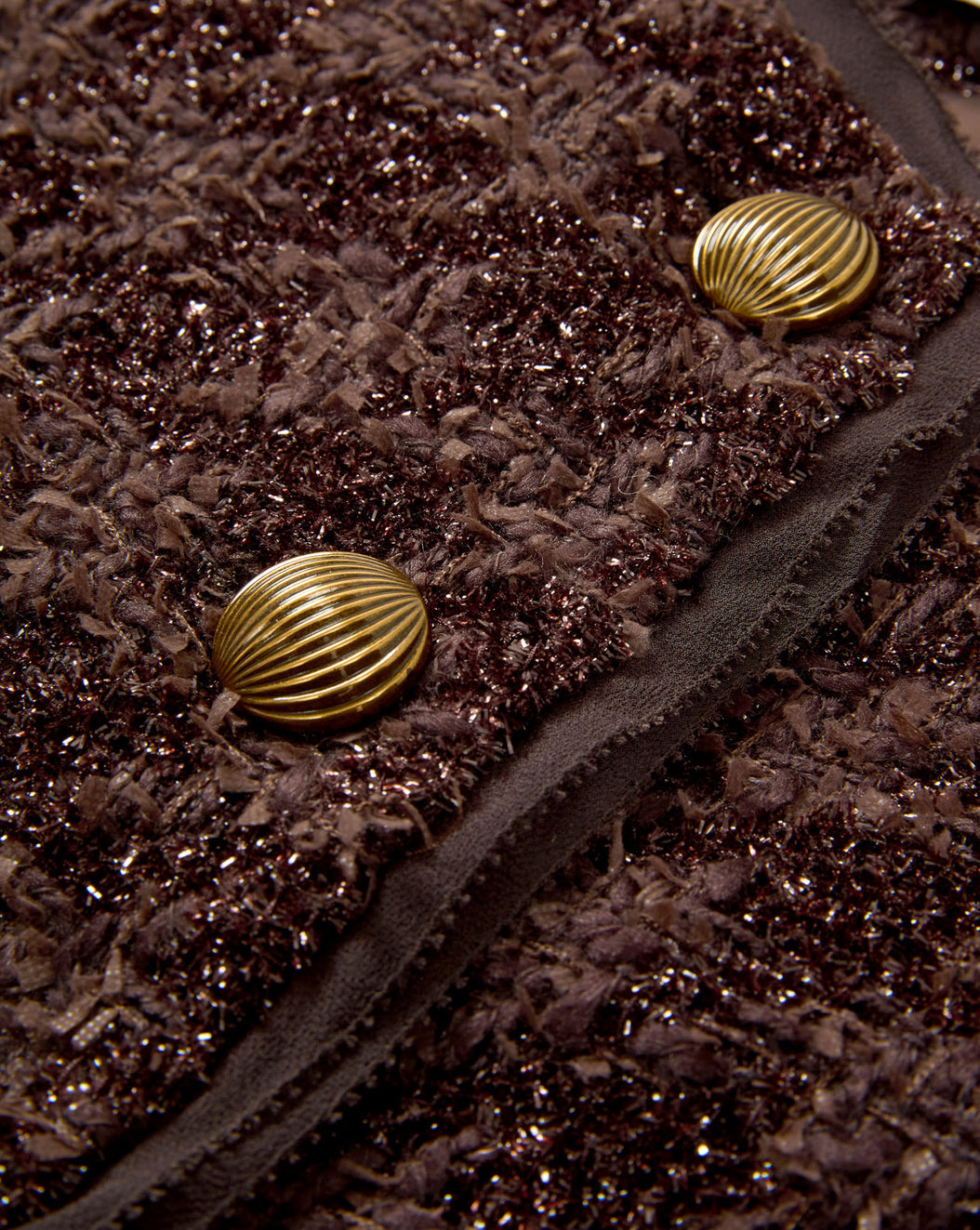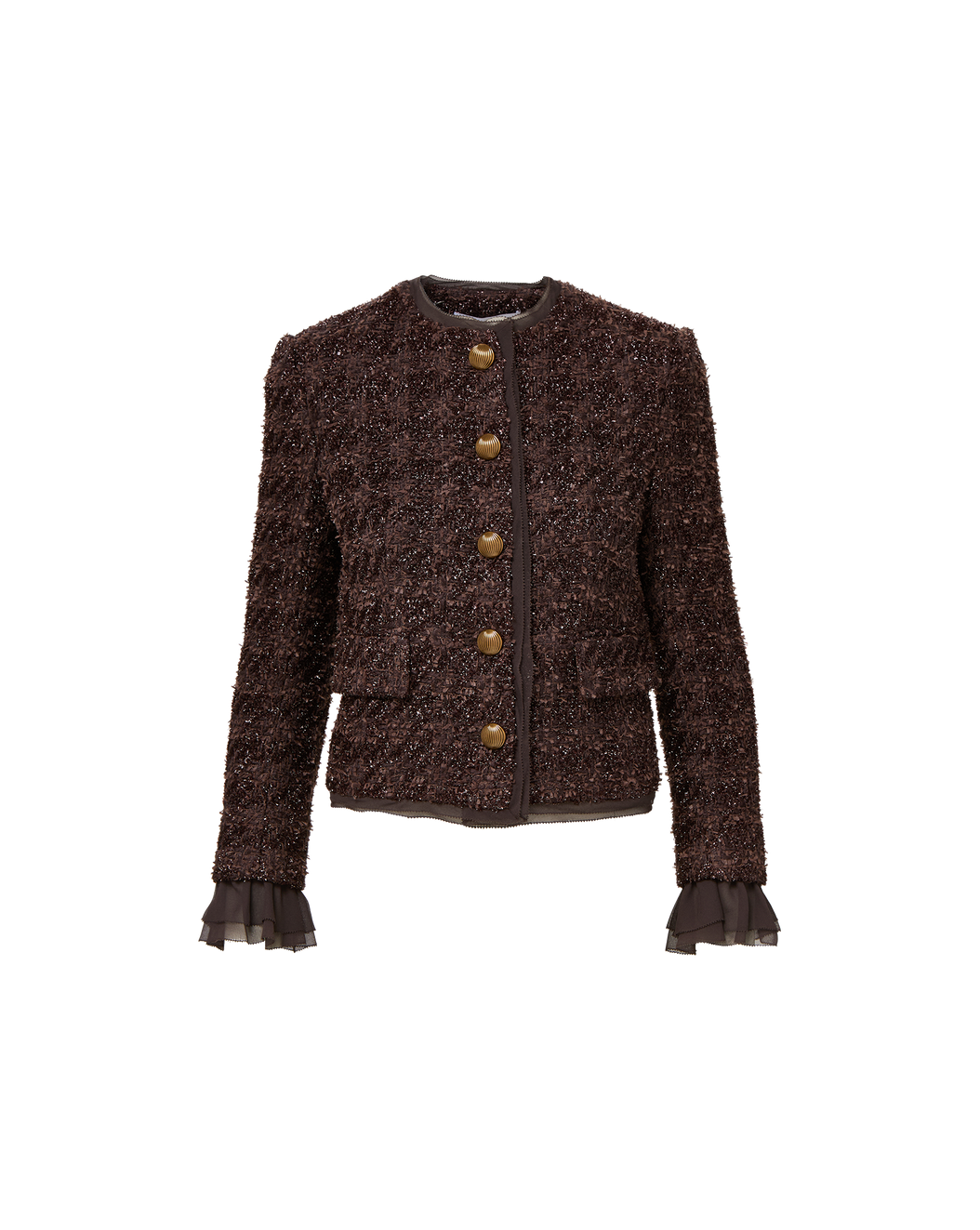 The classic lady jacket gets a high-shine update in the Audrina. Crafted from maroon tweed with a metallic houndstooth pattern, this statement piece features a fitted, cropped silhouette and collarless neckline. Sheer trim and removable peekaboo ruffled cuffs add romance, while gold-ribbed buttons finish the look with elevated detail. Perfectly versatile, style it with corduroy jeans for casual elegance or pair with a maxi skirt for a polished finish.