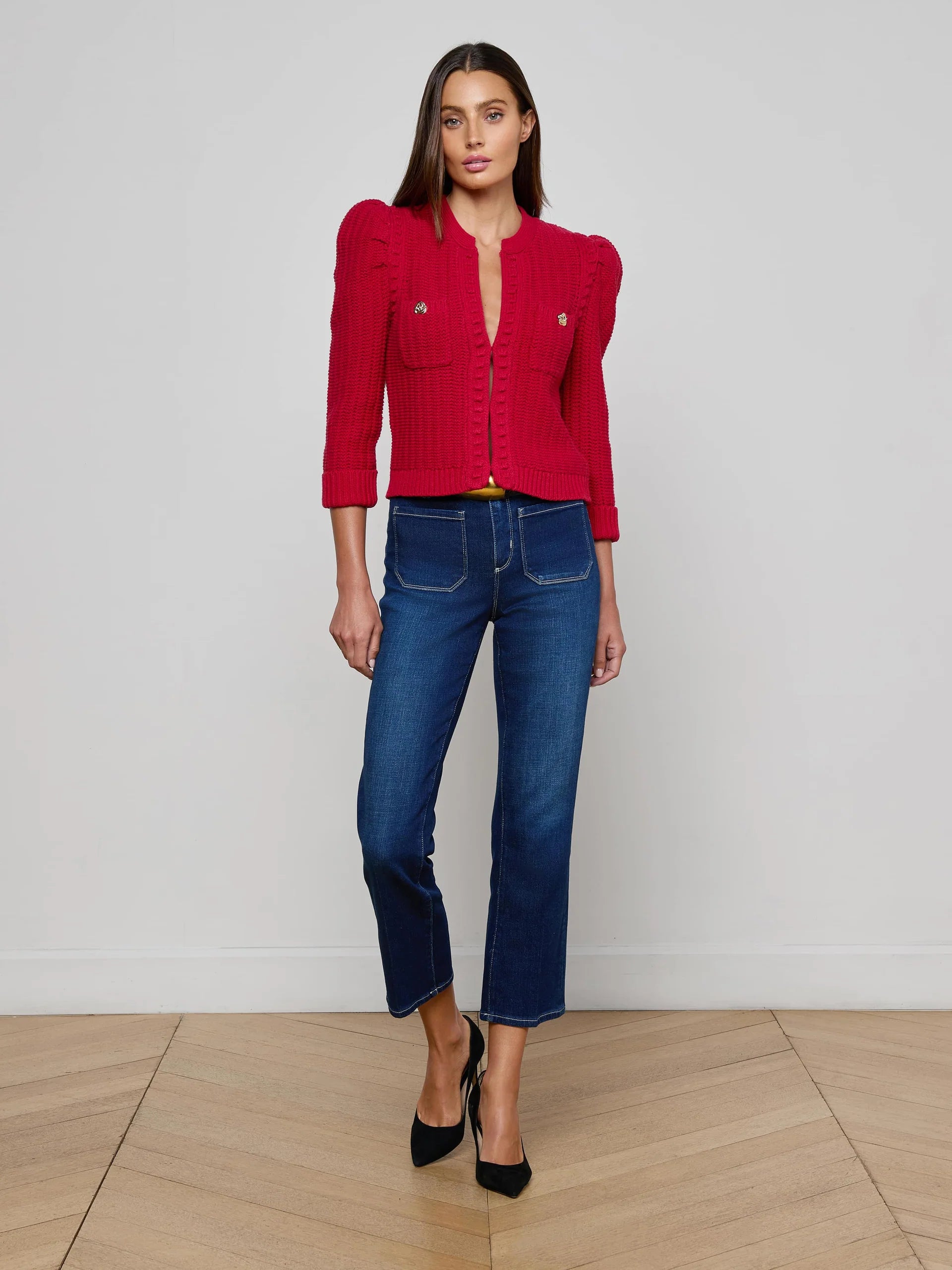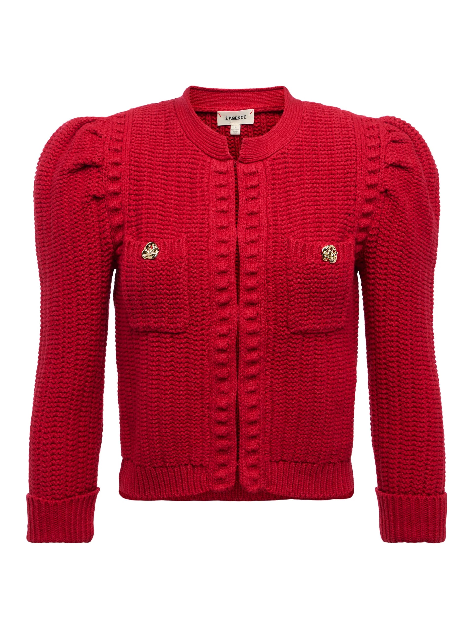 The Delli Cardigan brings structure and sophistication to your wardrobe with a feminine twist. Crafted in a richly textured knit, it features sculpted puff shoulders and three-quarter sleeves that strike the perfect balance between statement and subtle. Gold crest buttons at the chest pockets add a hint of polish, while the cropped, boxy silhouette keeps the look modern. Style it open over a simple tank for day or buttoned up with sleek trousers for night.