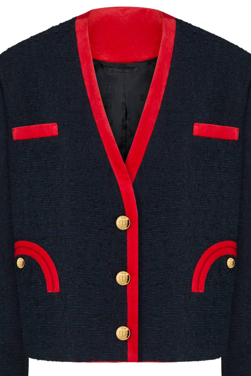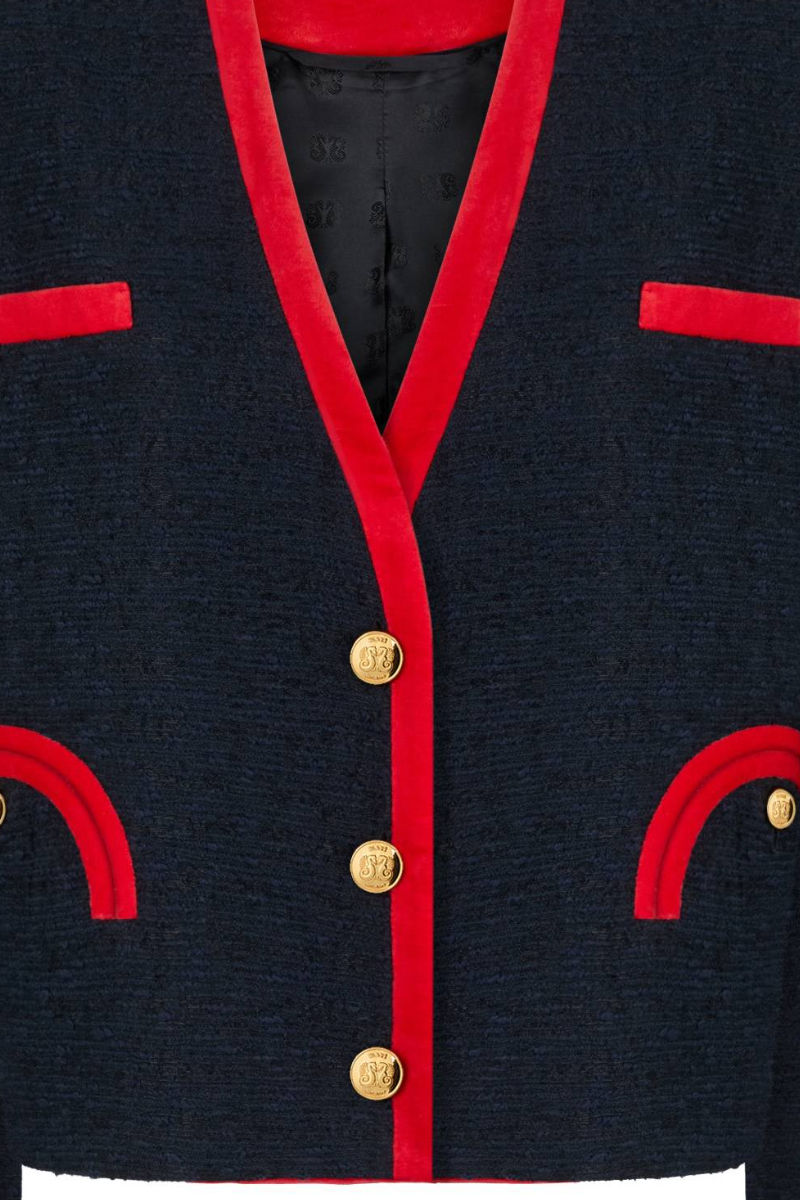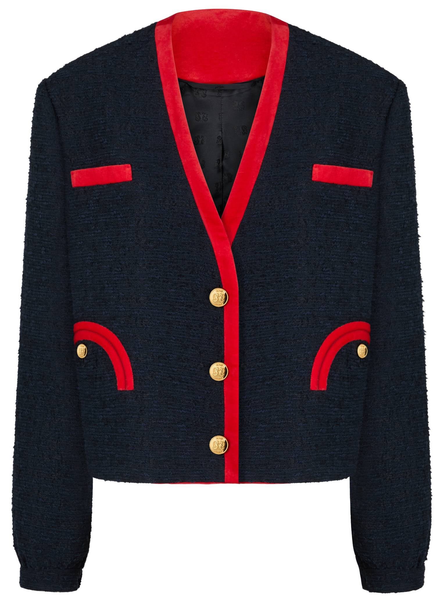 An exquisite blend of Italian craftsmanship and bold design, the Esense Riviera Bolero by Blazé Milano reimagines classic tailoring with a modern, luxurious twist. Crafted from a rich navy cotton-blend tweed, this cropped jacket features striking red velvet trim along the lapels and pockets, adding depth and contrast to the timeless silhouette. The piece is finished with Blazé Milano’s signature gold-tone buttons and the brand’s iconic curved “Smiley” pockets, creating a refined yet playful look.