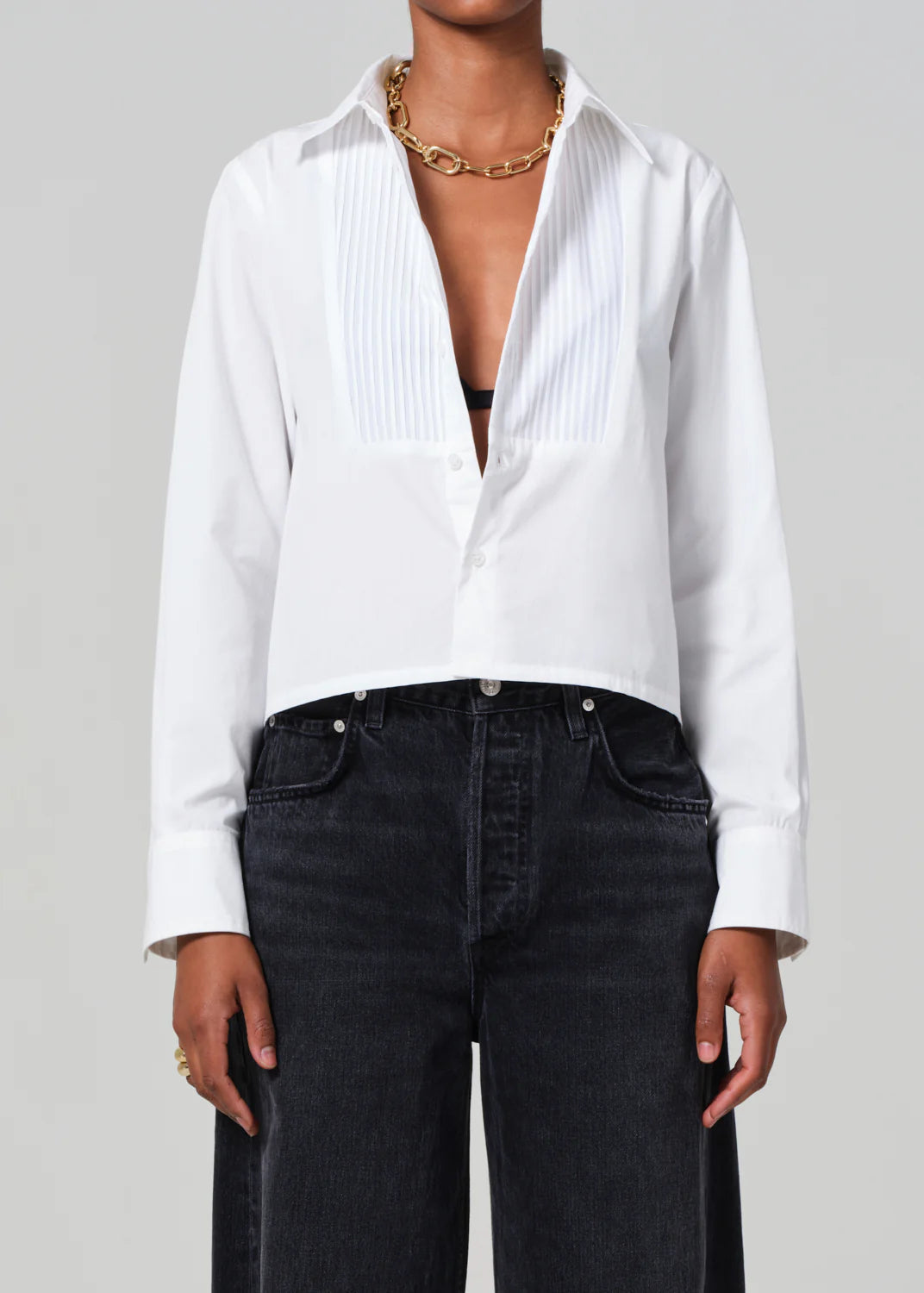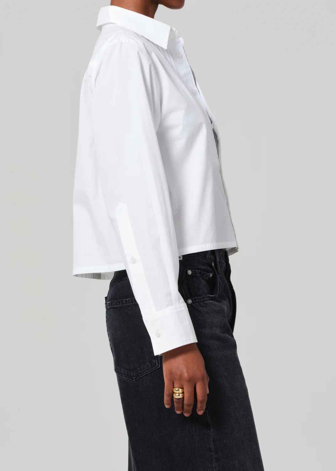 Effortless and refined, the Fino Top brings modern ease to a timeless silhouette. Designed with a crisp, cropped shape and subtle tuxedo-inspired detailing, it delivers understated polish in stark white poplin. Lightweight and versatile, this piece pairs beautifully with tailored trousers or high-rise denim for an elevated everyday look.