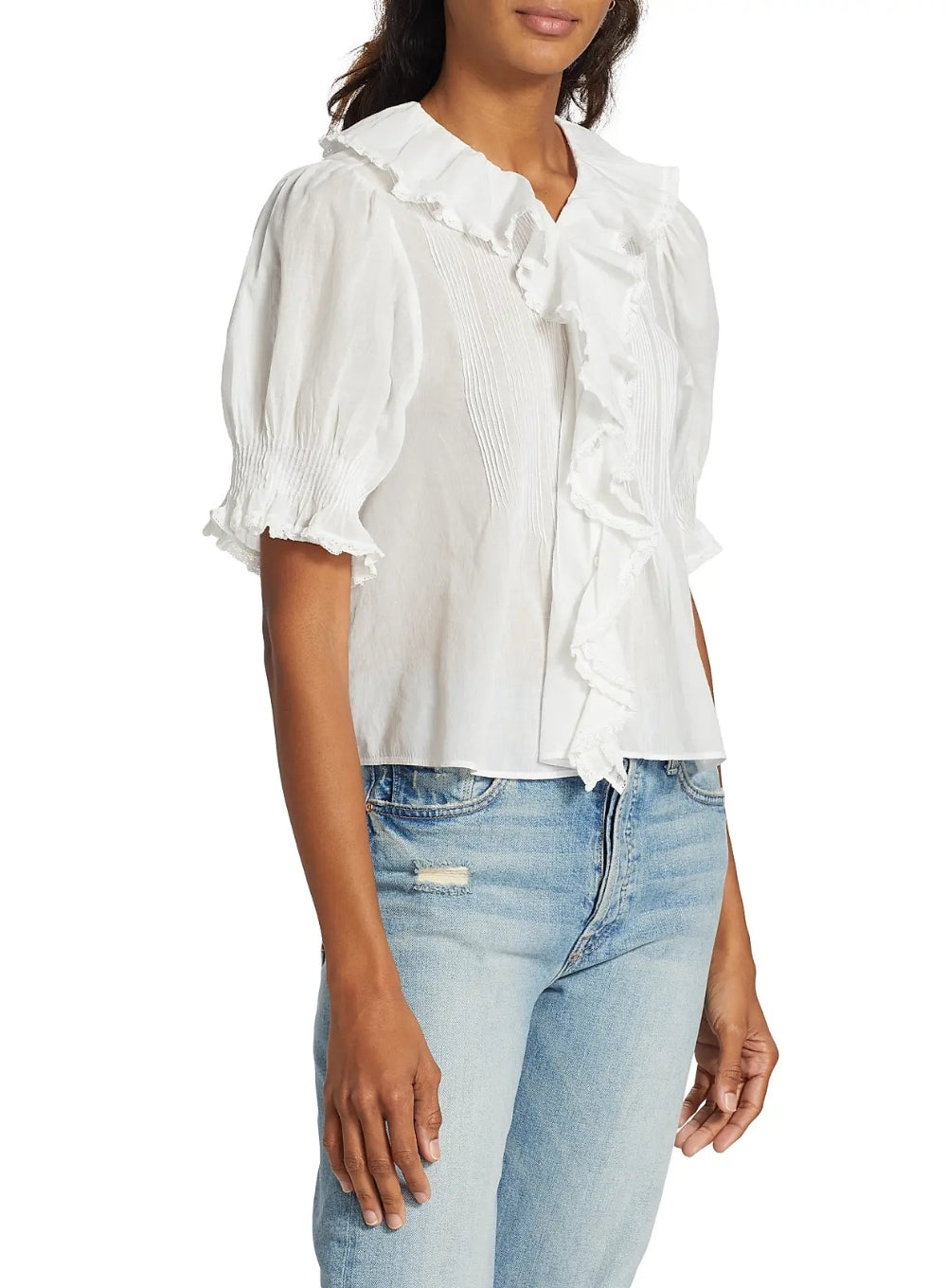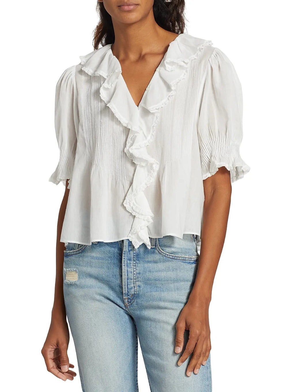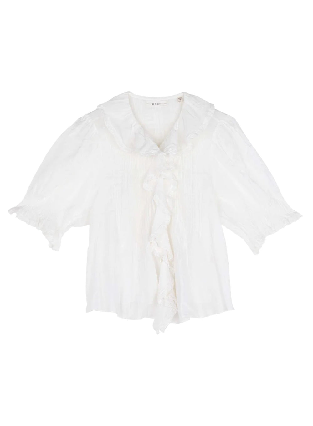 The Henri Top by Dôen is crafted from the softest 100% organic cotton voile for an airy, delicate feel. Edwardian-inspired, it features a plunging V-neckline framed by cascading lace-trimmed ruffles that extend down the bodice. Pintuck detailing adds subtle texture at the yoke, back, and short puffed sleeves. A concealed row of starburst buttons completes the romantic silhouette.