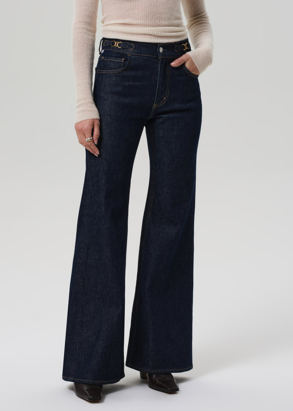 The Kimberly is a high-rise flare inspired by classic ‘70s silhouettes, designed to elongate the leg and contour the waist. This version is finished with refined horsebit detailing at the waistband, giving a chic, equestrian-inspired edge. Crafted from comfort stretch denim with a soft hand, the clean dark indigo rinse of the Helia wash delivers a polished, versatile finish. Perfect styled with crisp shirting or a slim knit for elevated ease.