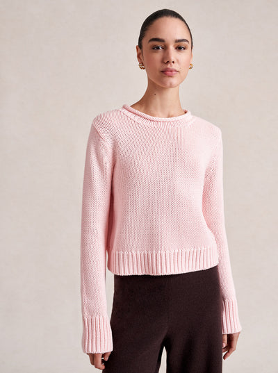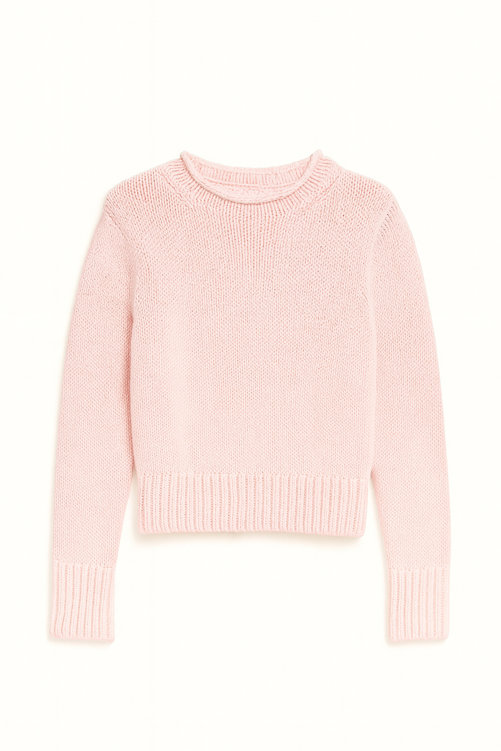 The LA LIGNE Solid Mini Marina Sweater brings a fresh twist to the brand’s iconic silhouette—now available in timeless solid colors. Knit from the best-selling chunky 100% cotton yarn, it features the signature Marina rollneck you know and love, delivering both comfort and effortless style. With its cropped fit, ribbed cuffs and hem, and soft blush-pink hue, this modern classic pairs perfectly with high-waisted denim, skirts, or tailored trousers for year-round wear.