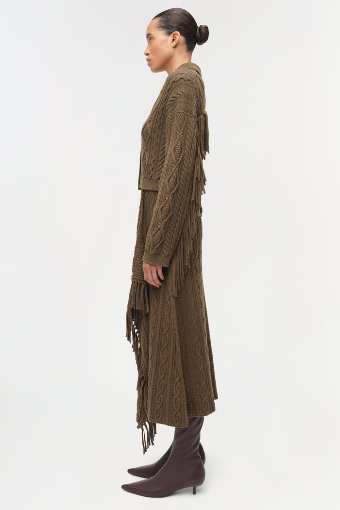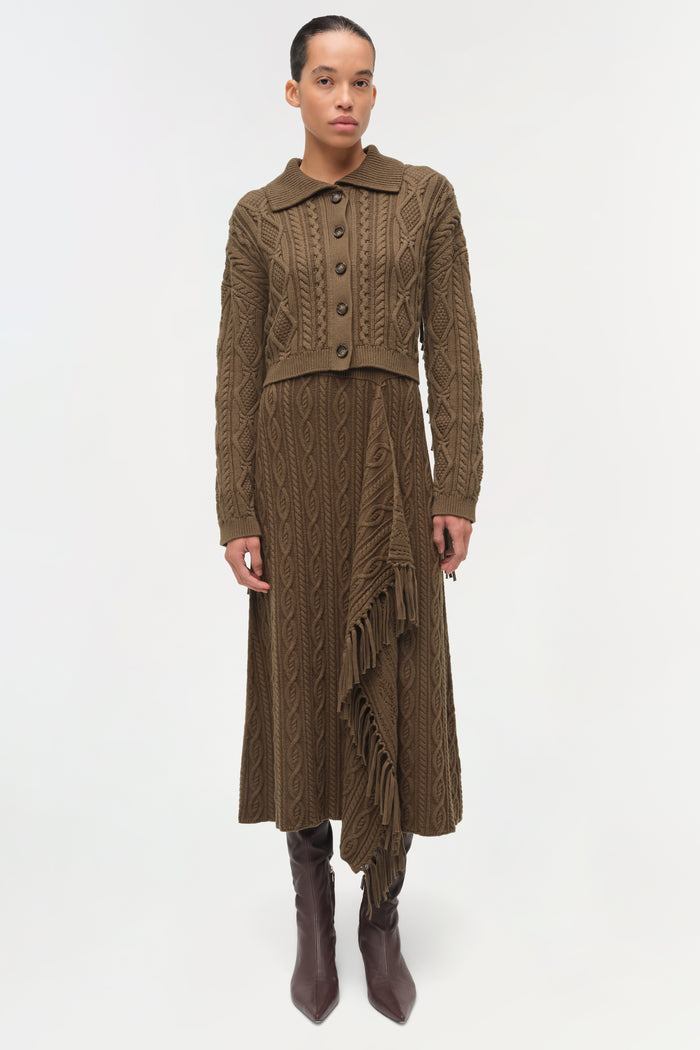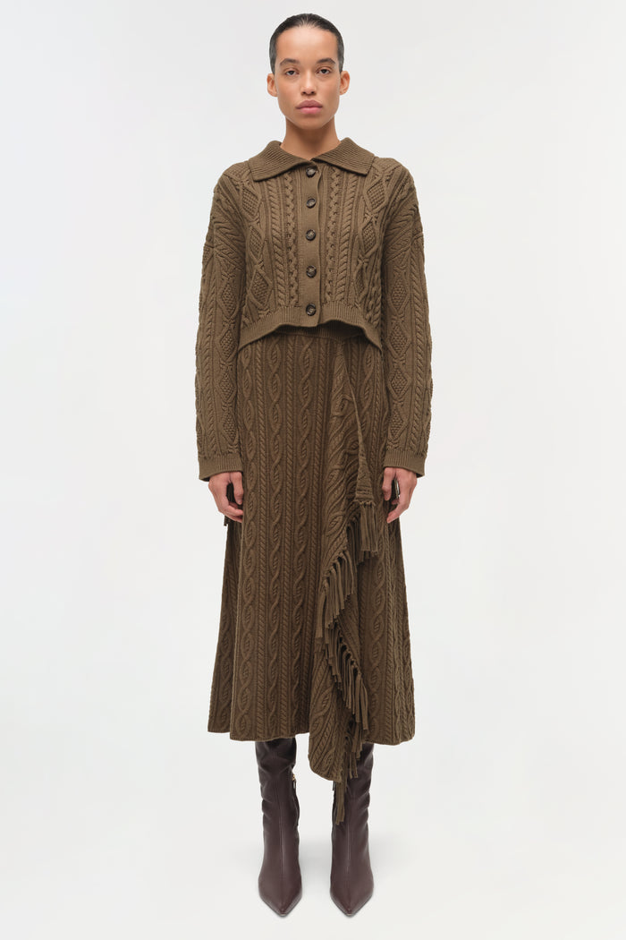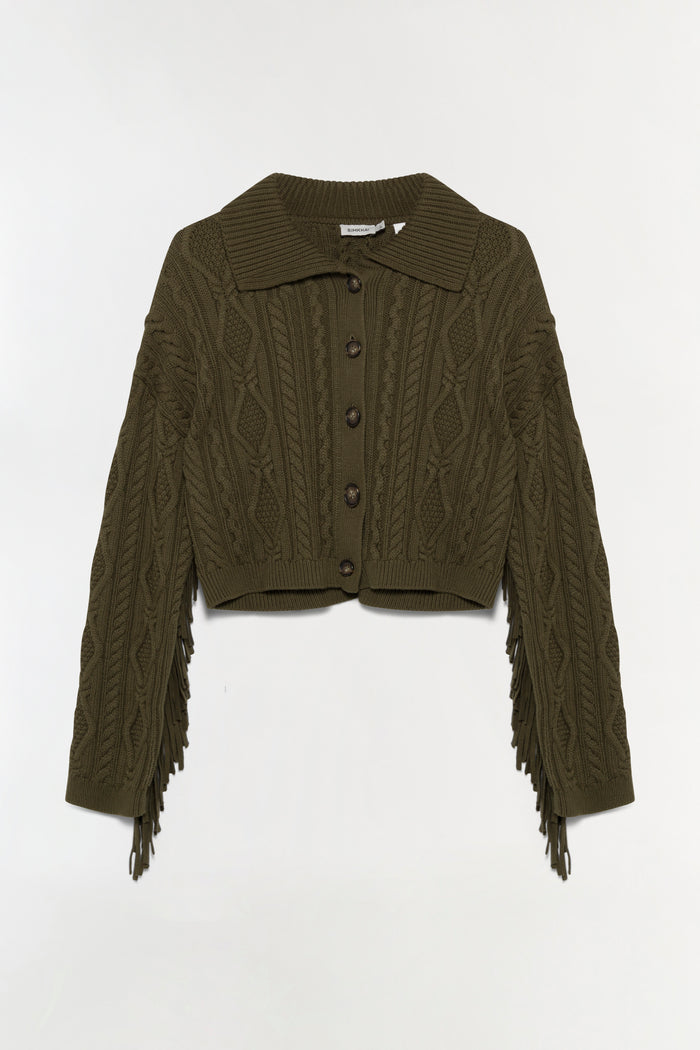 A fresh take on the classic cable knit, this cropped sweater is crafted from a soft wool-cotton blend for comfort and texture. Designed with a pointed collar and button-front closure, it’s detailed with fringe along the back and sleeves—adding playful movement and a modern twist to a timeless silhouette.