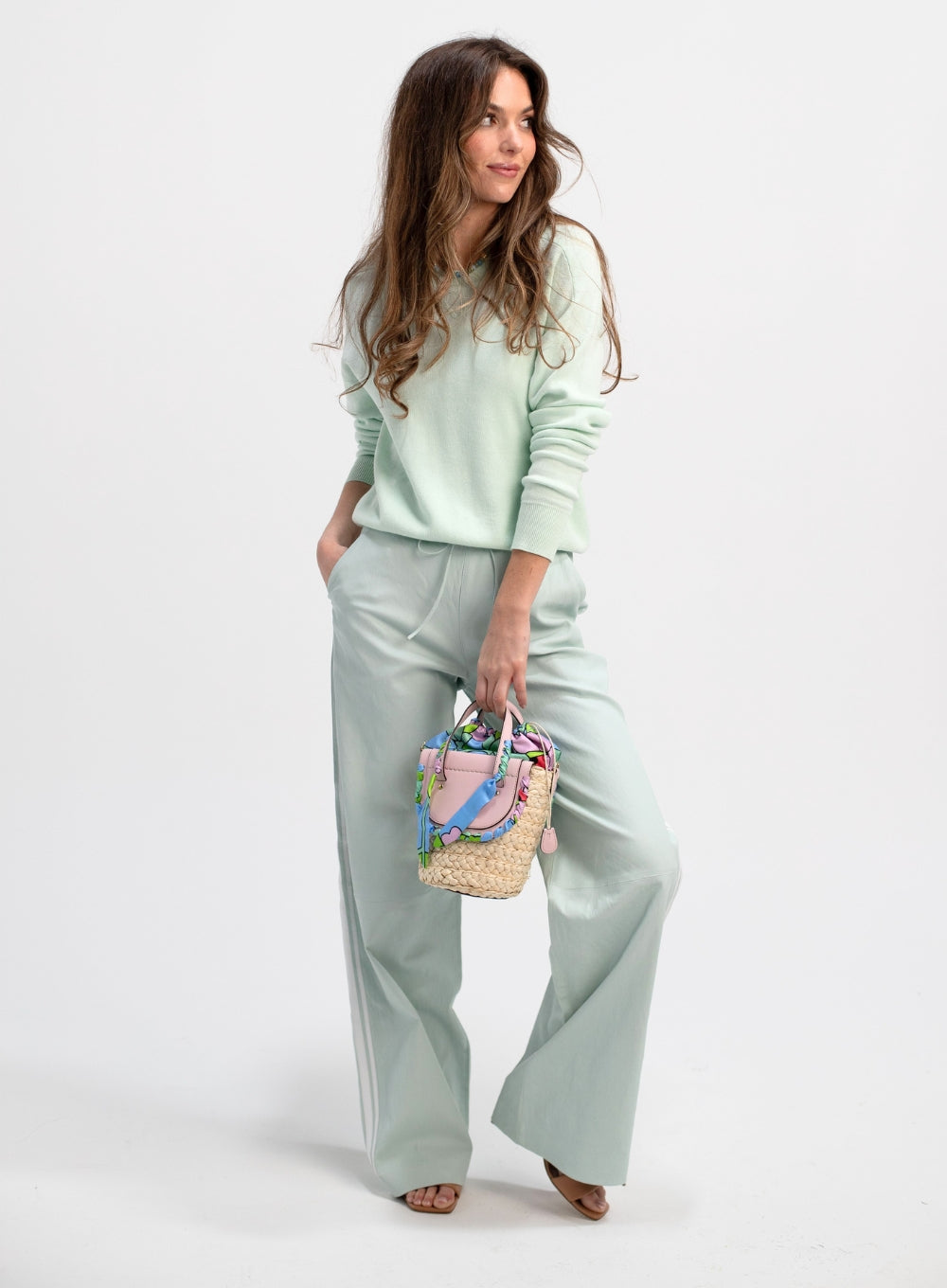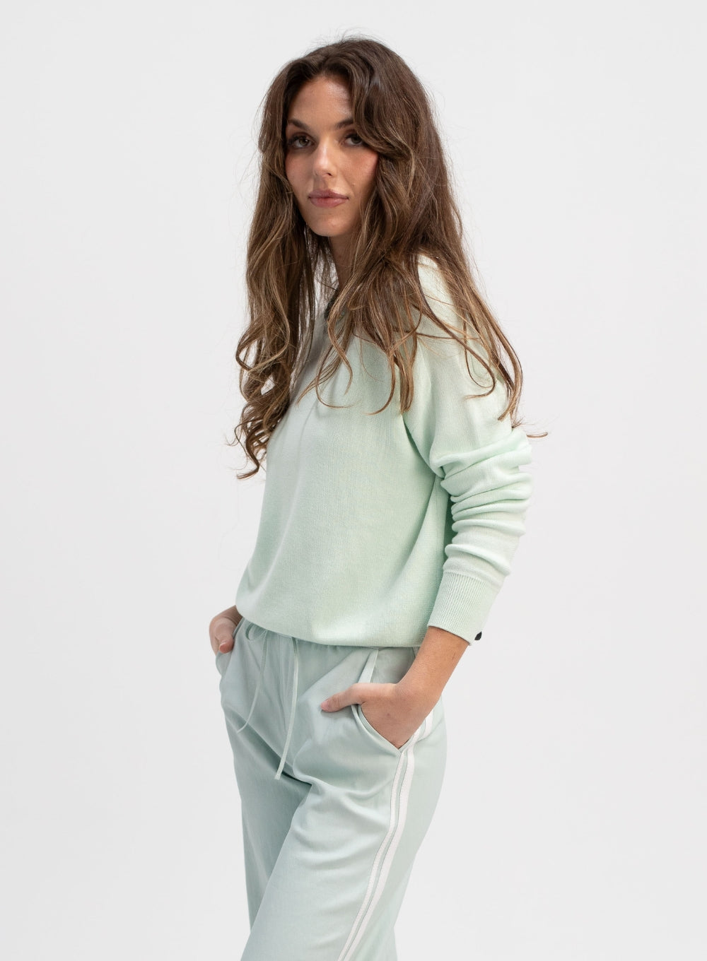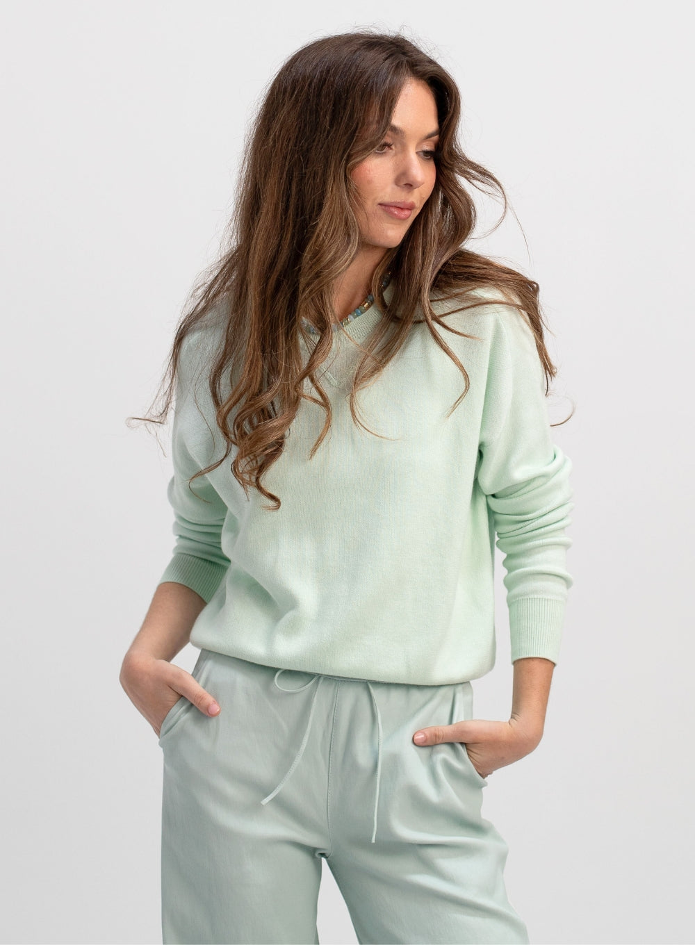 The Warwick Pullover in Bermuda from One Grey Day is knit in a cotton blend yarn. This classic sweater can be styled countless ways. Style it with this SPRWMN pant to get the look shown.
